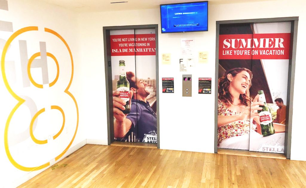 Quảng cáo bằng decal dán bên trong hoặc ngoài cửa thang máy